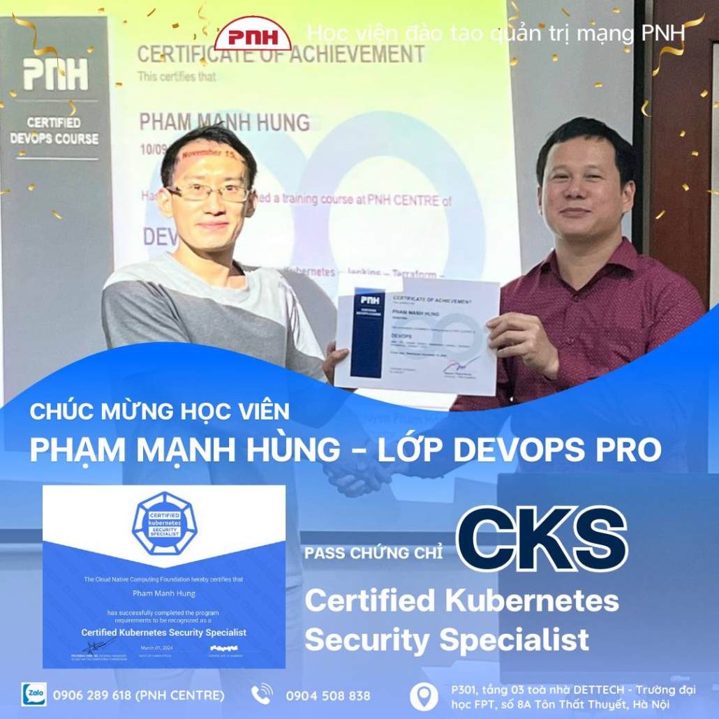 Chúc mừng học viên Phạm Mạnh Hùng – Lớp DevOps tại học viện PNH đã xuất sắc pass chứng chỉ CKA, CKAD, CKS